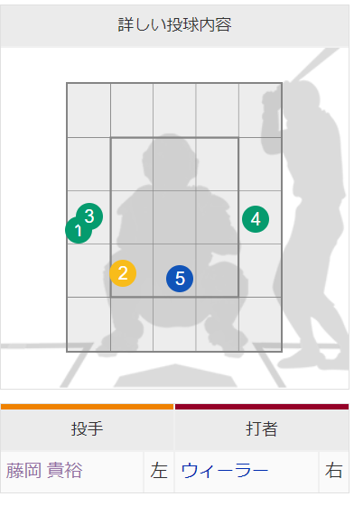 今回右打者はウィーラー、太田選手の2名のみだったためこのような偏りとなっていますが、右に対しては明らかに攻めに苦慮していました。左に対しては130中盤ながらストレートをコントロールよく決め込み、そこに今年から試しているカーブで緩急をつけていました。