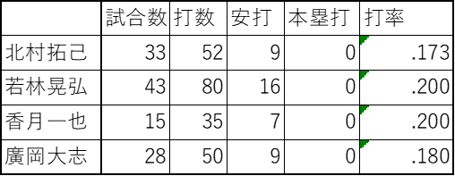 そのためこの二人がランナーで出ても代走を出せず、得点圏にランナーを進めるといったことが出来ないため、終盤での1点を逃してしまう場面が目立ちました。外野はある程度足がある選手が起用されるため代走を出す必要性が低く、菊田選手が守備緩めにならないレベルの守備が出来れば、代走を出した後に菊田選手を代打→そのまま代走を出した選手の守備位置に起用、といった起用法が使えます。