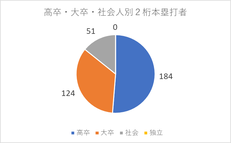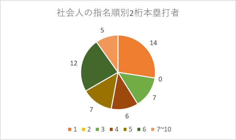 一方で2桁本塁打者全体の割合に対し、社会人は14%と総数が少なく、社会人は安定した今の立場を捨ててプロに挑むことになるため順位縛りを設ける候補も多いのが実情。そもそも候補が少なく、社会人でスラッガーを求めるのは戦略として現実的ではありません。下位からの成功率は高いが、そもそも指名数が少ないのが社会人スラッガーになります。